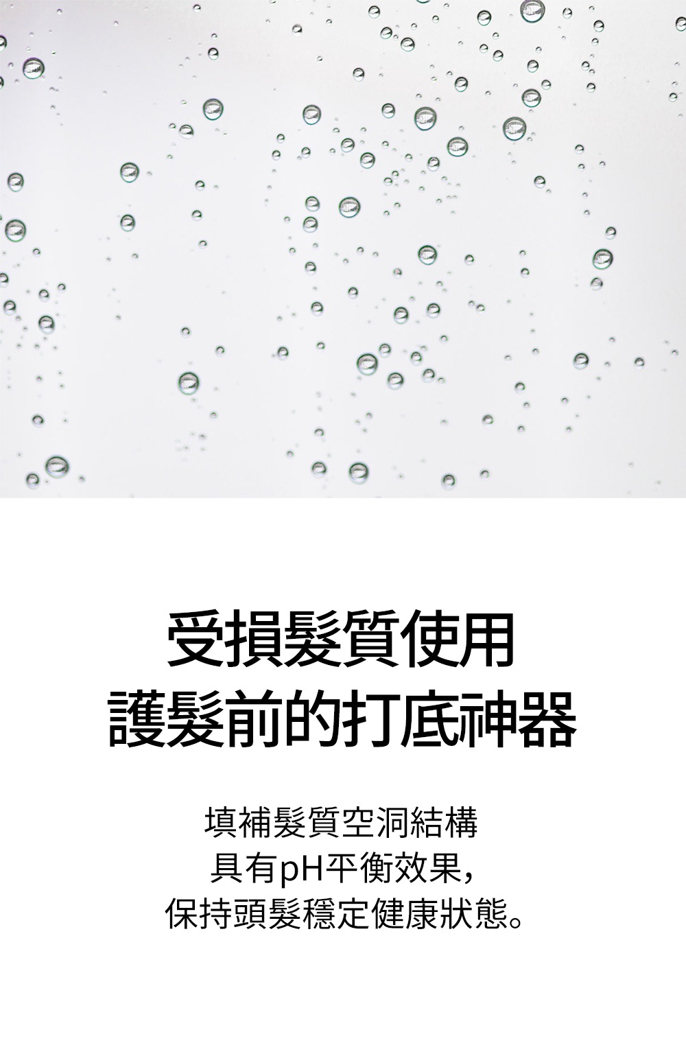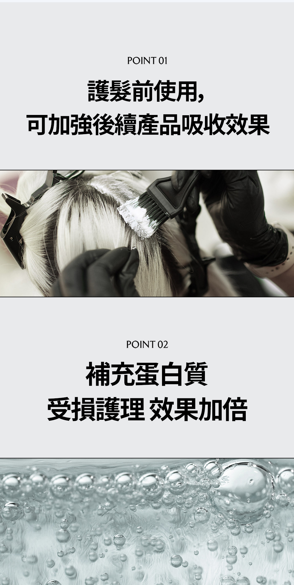 .防止髮絲中蛋白質流失,於髮絲表層添加『高濃縮多肽』保護膜,使添加於髮質中的蛋白質修護維持長久。