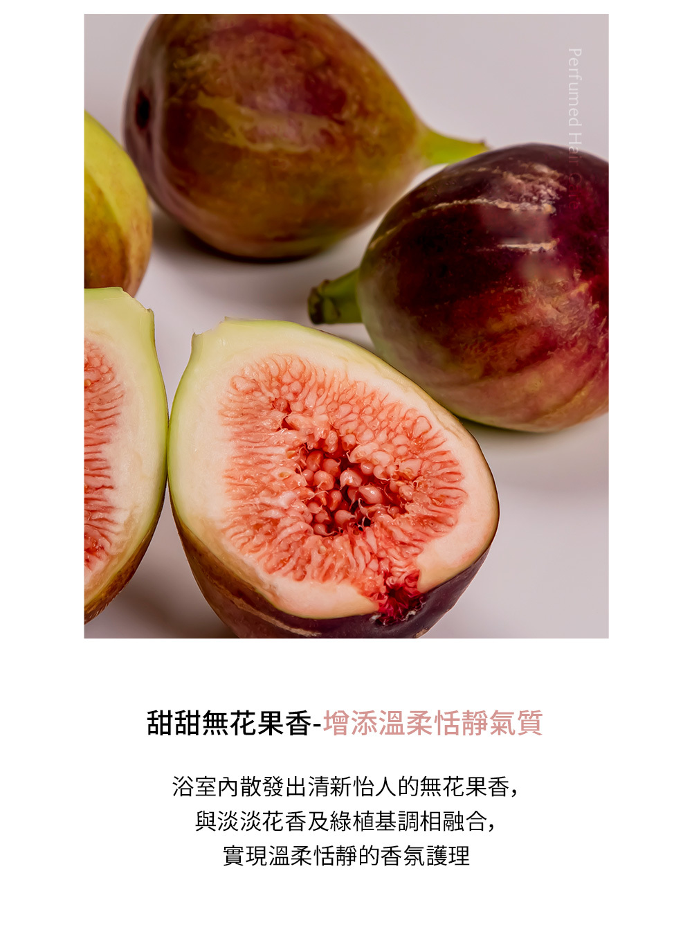 迅速為受損髮注入水分及營養,防止頭髮乾燥和靜電,使秀髮柔順有彈性,無花果和無花果莖葉的氣味,為秀髮帶來淡淡的香味。