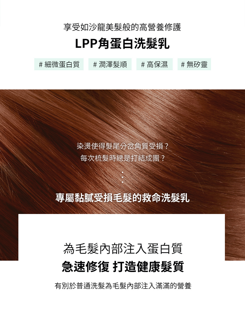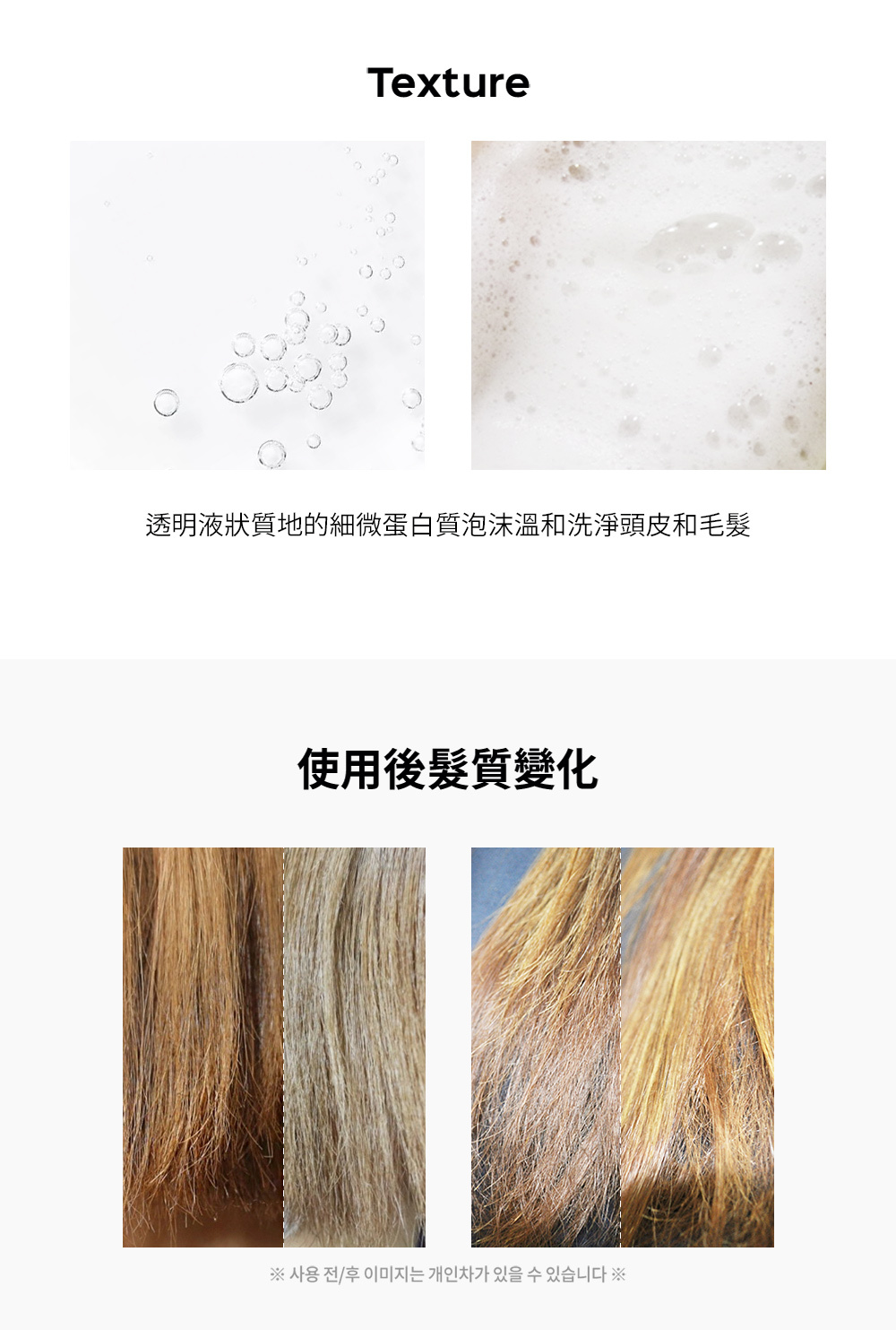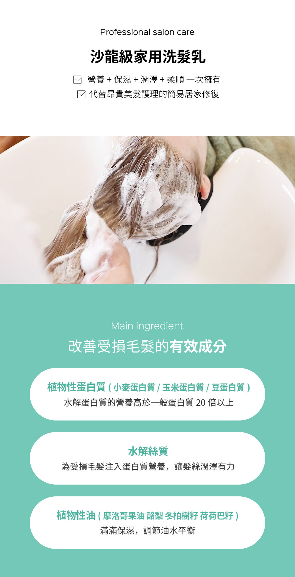 ・含三種蛋白質和天然植物油成分,使髮絲健康有彈性,深層清潔並保持油水平衡,無添加矽靈。