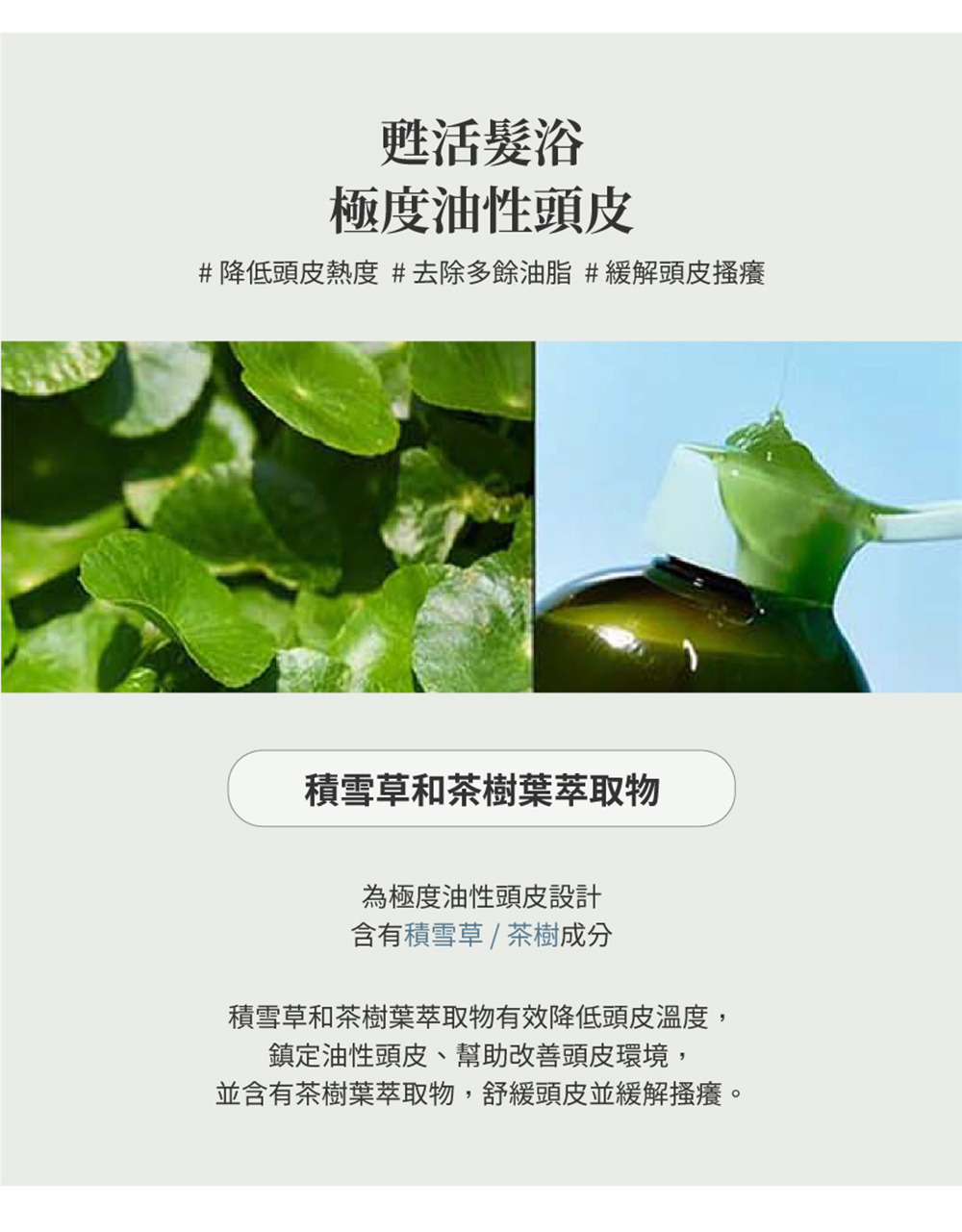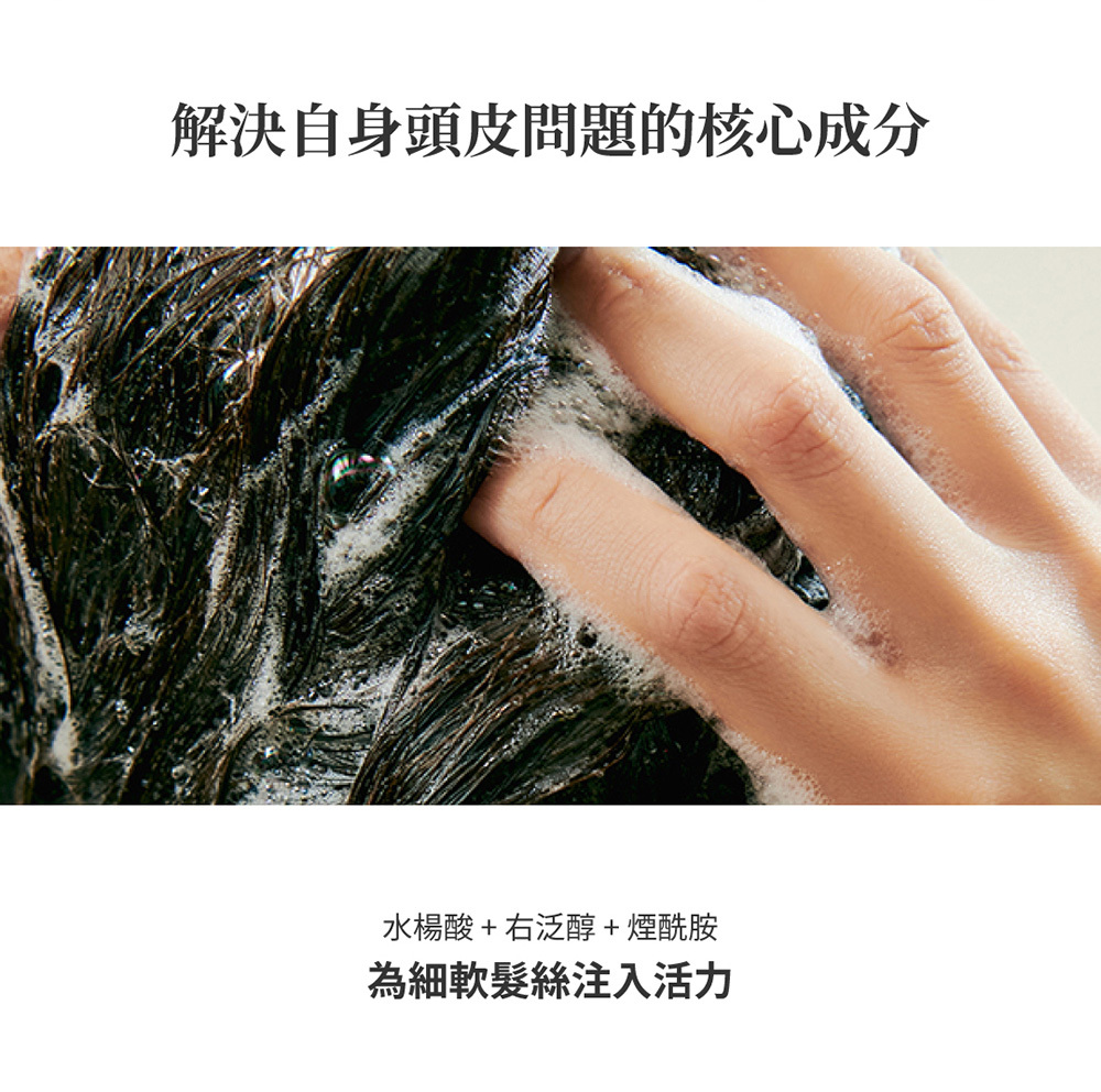 積雪草和茶樹萃取物,幫助舒緩和清潔頭皮。