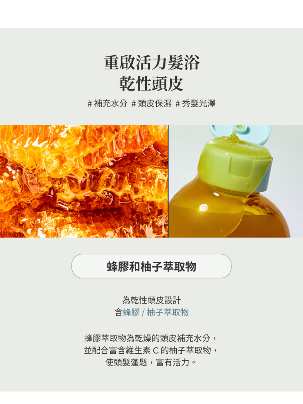 功能性髮浴,蜂膠和柚子萃取物為秀髮提供營養和水分,賦予秀髮豐盈且具自然光澤。