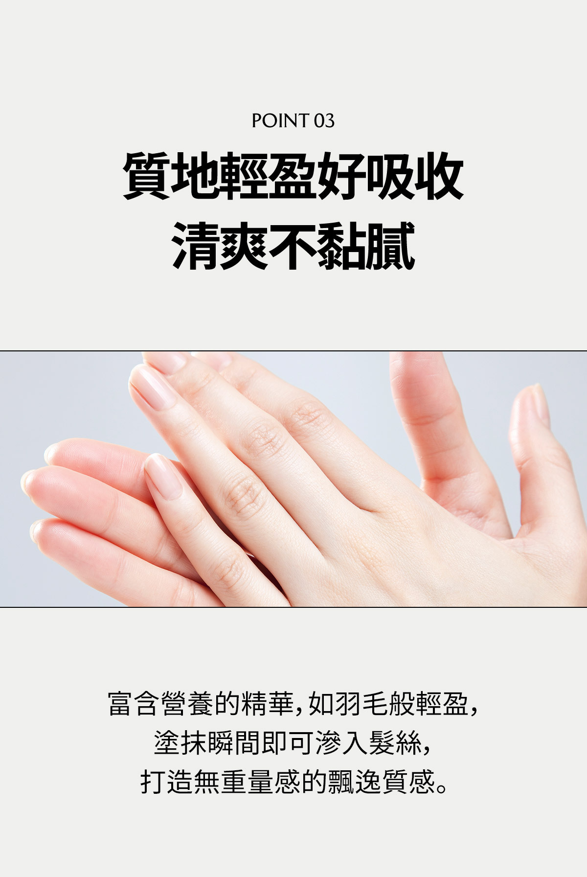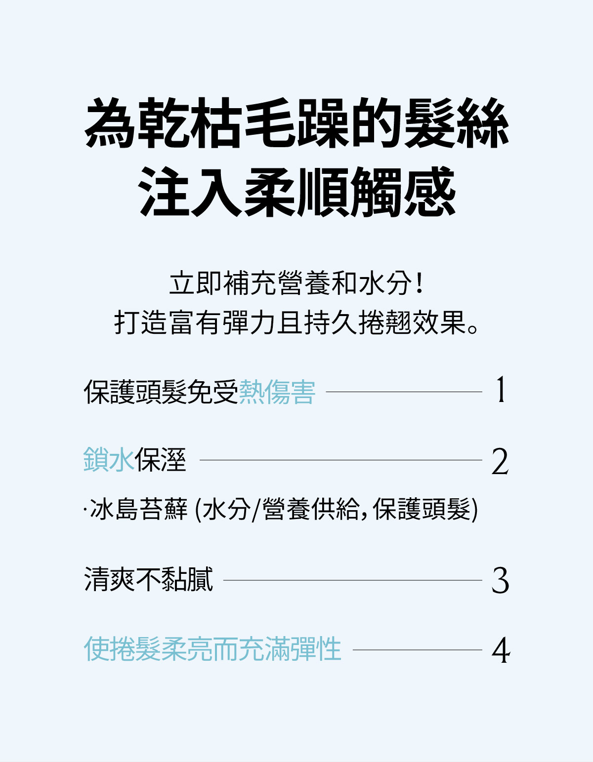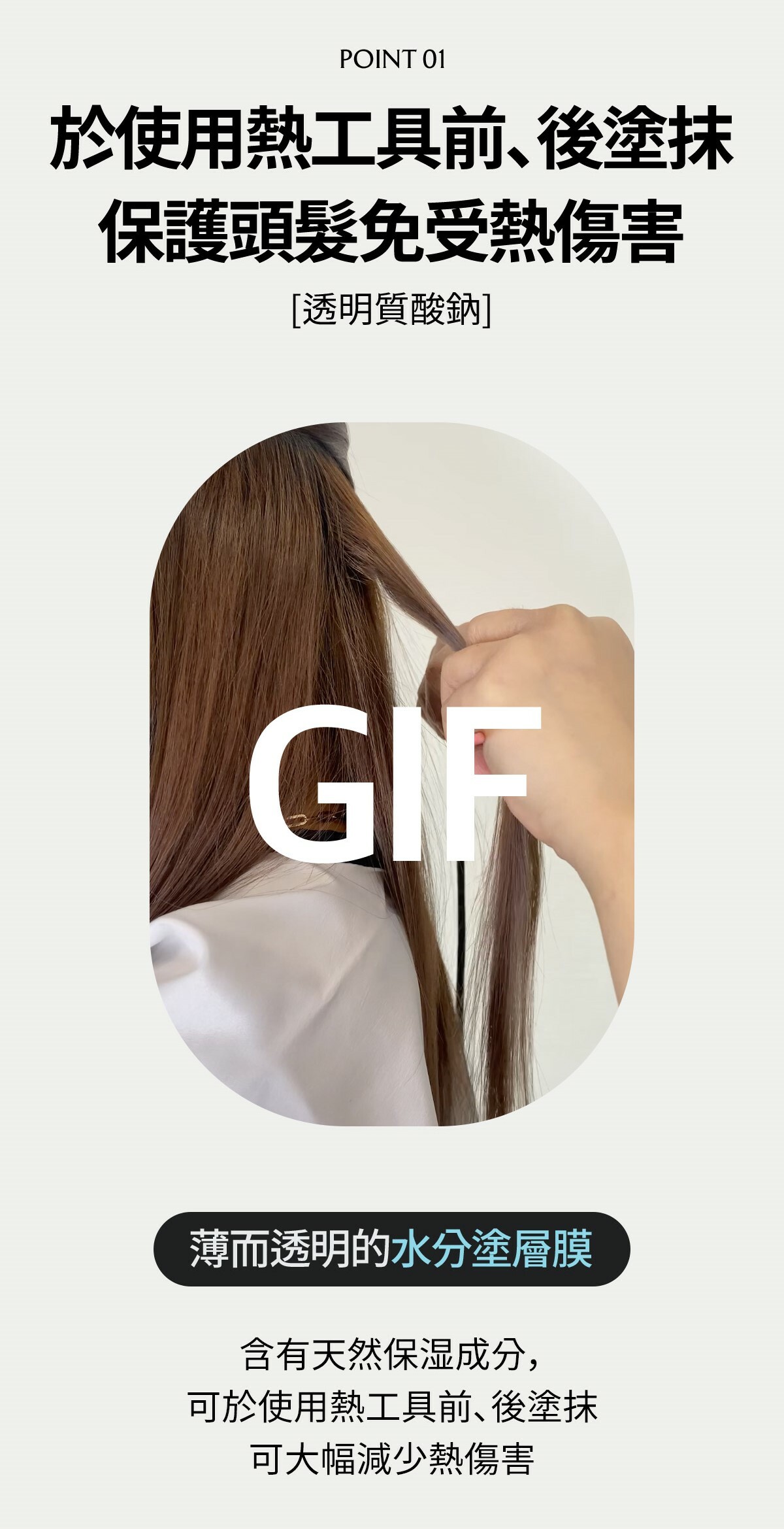 .滋潤柔軟髮絲,保濕鎖水不黏膩,使用在熱工具前後減少熱傷害。