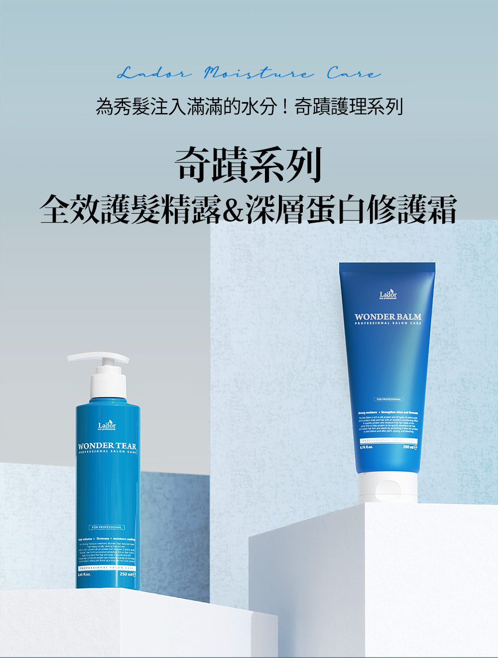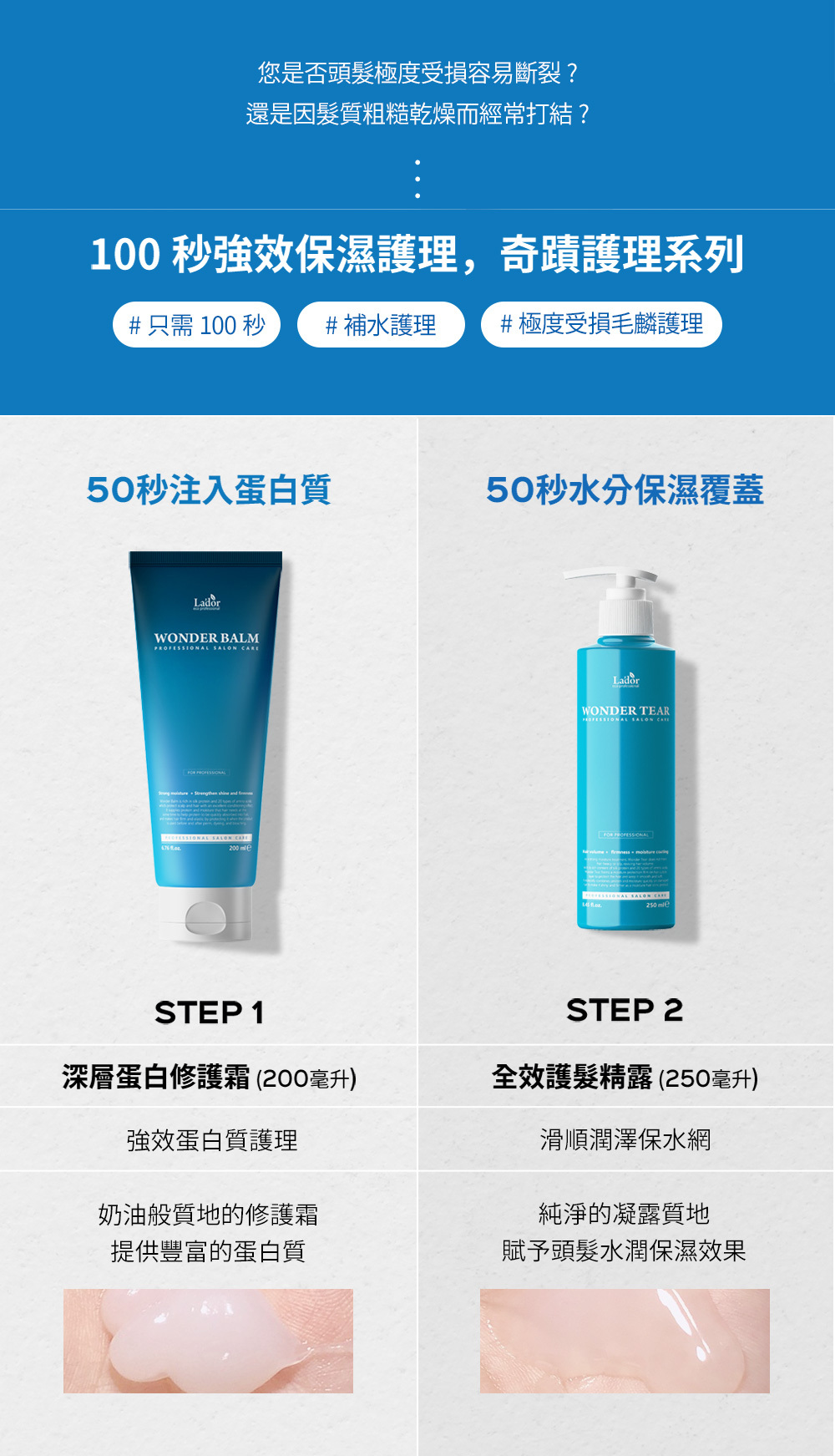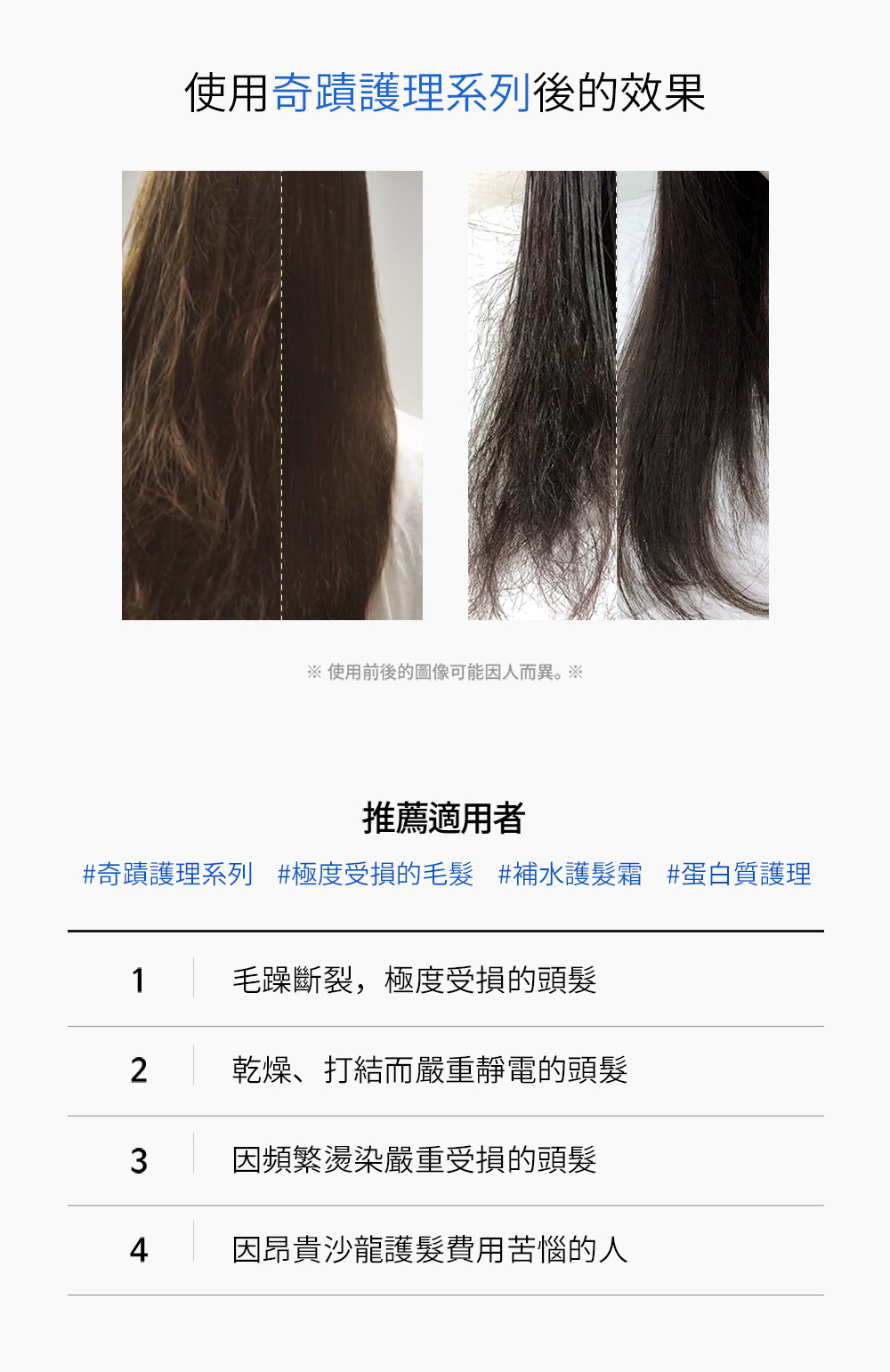 洗髮後,將深層蛋白修護霜均勻塗抹於頭髮上,停留 50 秒後以溫水沖淨。