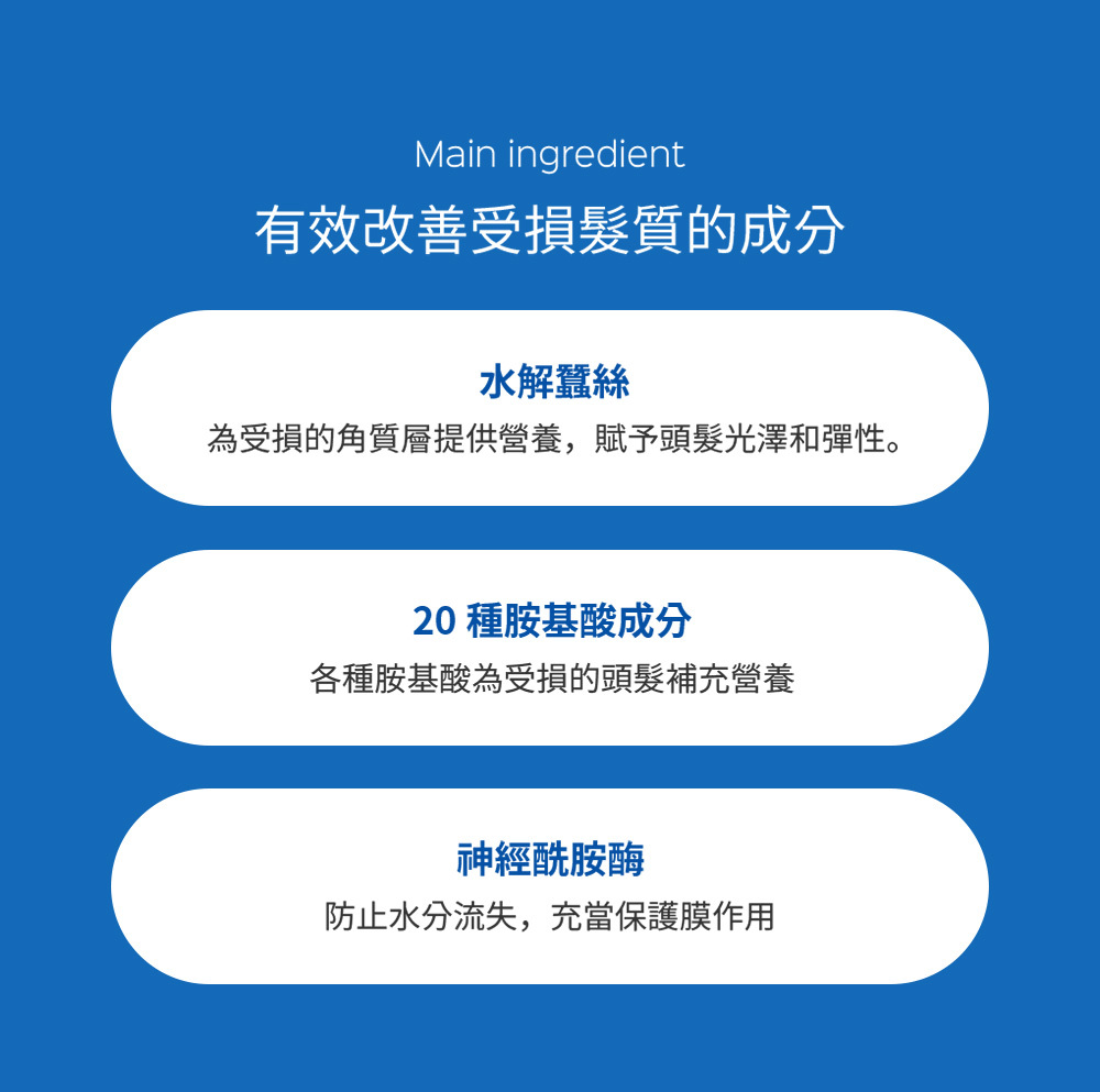 ・富含氨基酸、絲蛋白等成分,提供受損髮充分蛋白質強效修復。