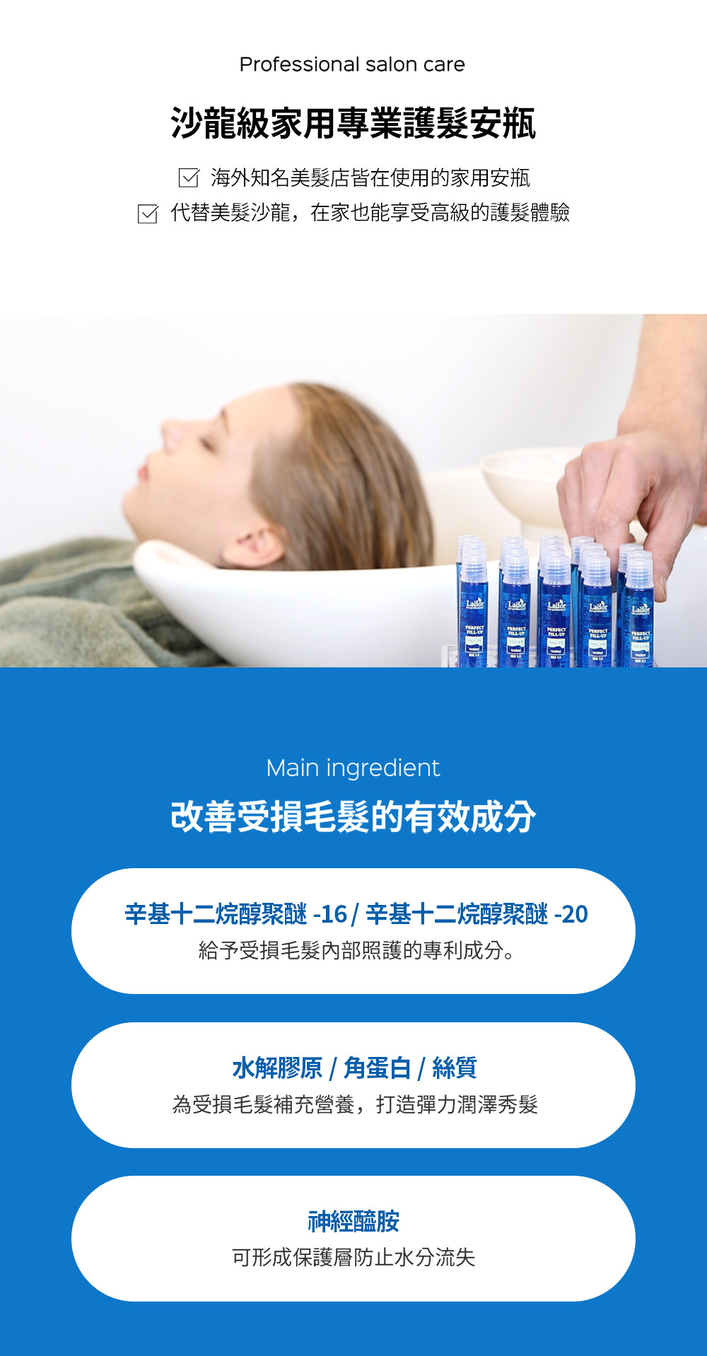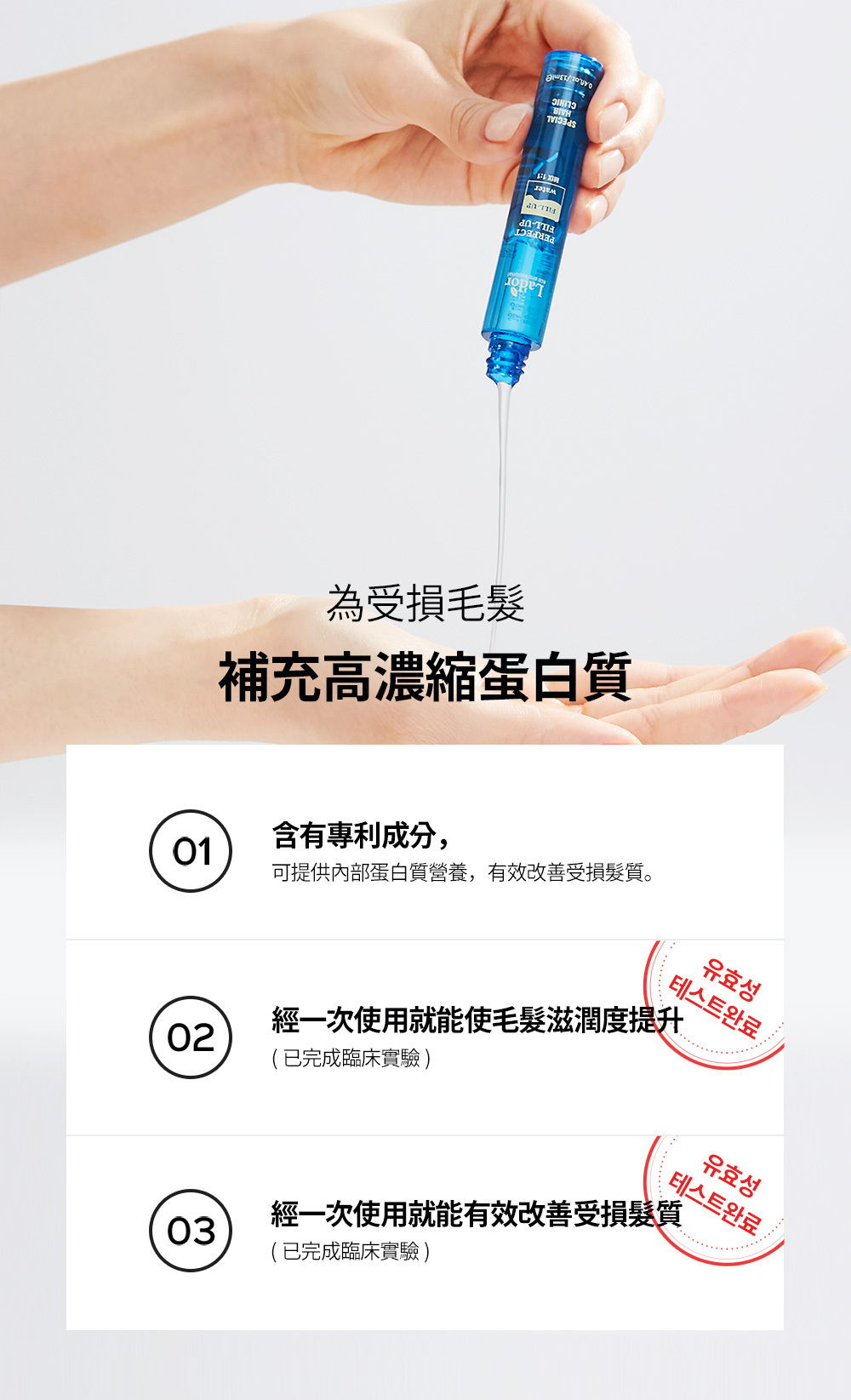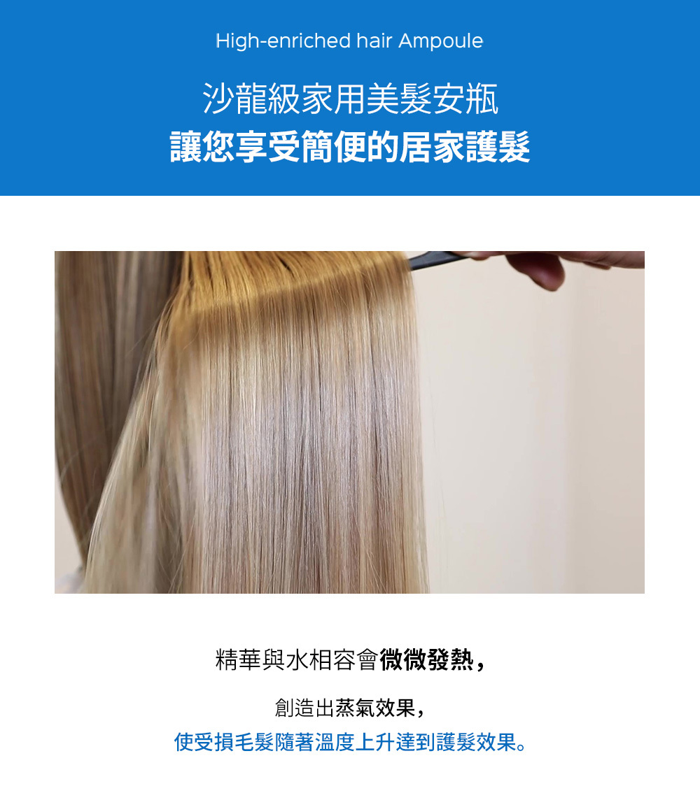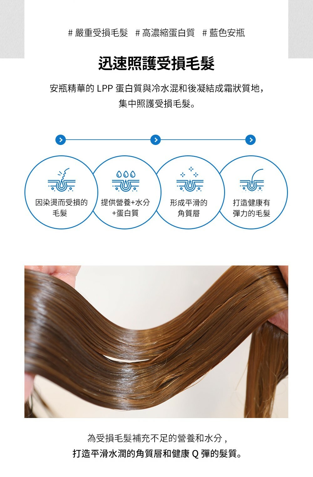 2. 取適量變成白色乳白狀的安瓶塗抹於受損髮上,按摩停留 5-10 分後沖洗。